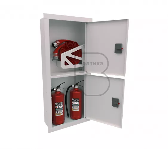Дверца пожарного шкафа открывается на 160 градусов, открывание двери универсальное (правое и левое). Дверца имеет дополнительные загибы для усиления жесткости конструкции. На двери и корпусе шкафа предусмотрены отверстия для опломбирования шкафа. Дверь пожарного шкафа имеет запорное устройство в виде пластиковой защелки. Дверь закреплена с помощью монтажного штифта, при необходимости она может быть снята в результате простого нажатия на кнопку штифта.
